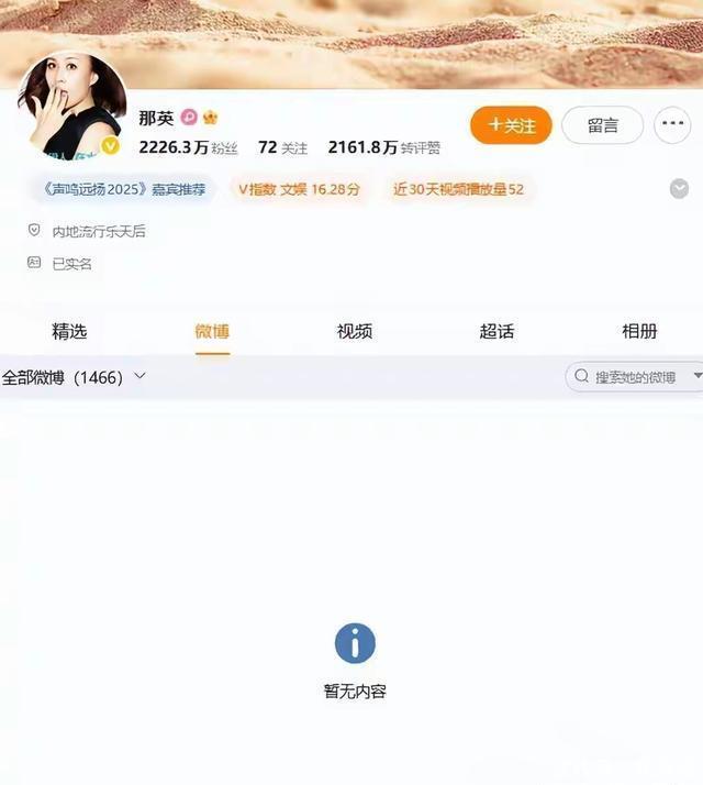 那英没有出来说一句话,只是默默的关闭了自己的微博。 把曾经一千多条动态全部清空,显然是不想被打扰的状态。 或许对于这桩婚姻真正的样子,她早已经清楚了。